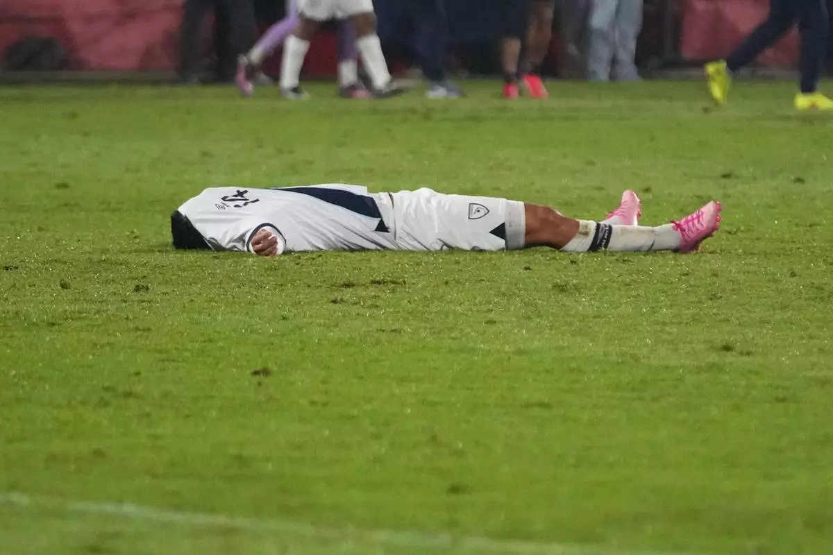 Guatemala's Darwin Lom reacts at the end of a World Cup 2026 qualifying soccer match against Panama in Guatemala City, Thursday, Nov. 13, 2025. (AP Photo/Moises Castillo)