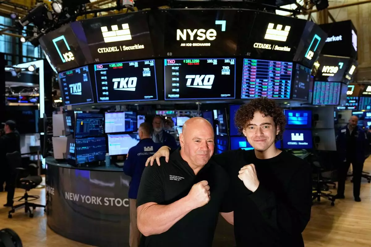 PolyMarket CEO Shayne Coplan, right, and UFC CEO Dana White pose for a picture on the floor of the New York Stock Exchange in New York, Thursday, Nov. 13, 2025. (AP Photo/Seth Wenig)