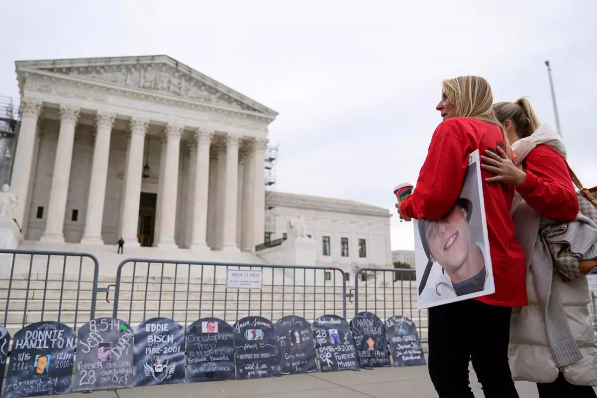 FILE - Jen Trejo holds a photo of her son Christopher as she is comforted outside the Supreme Court Dec. 4, 2023, in Washington. (AP Photo/Stephanie Scarbrough, File)