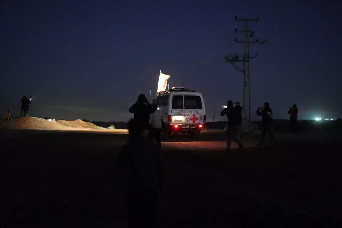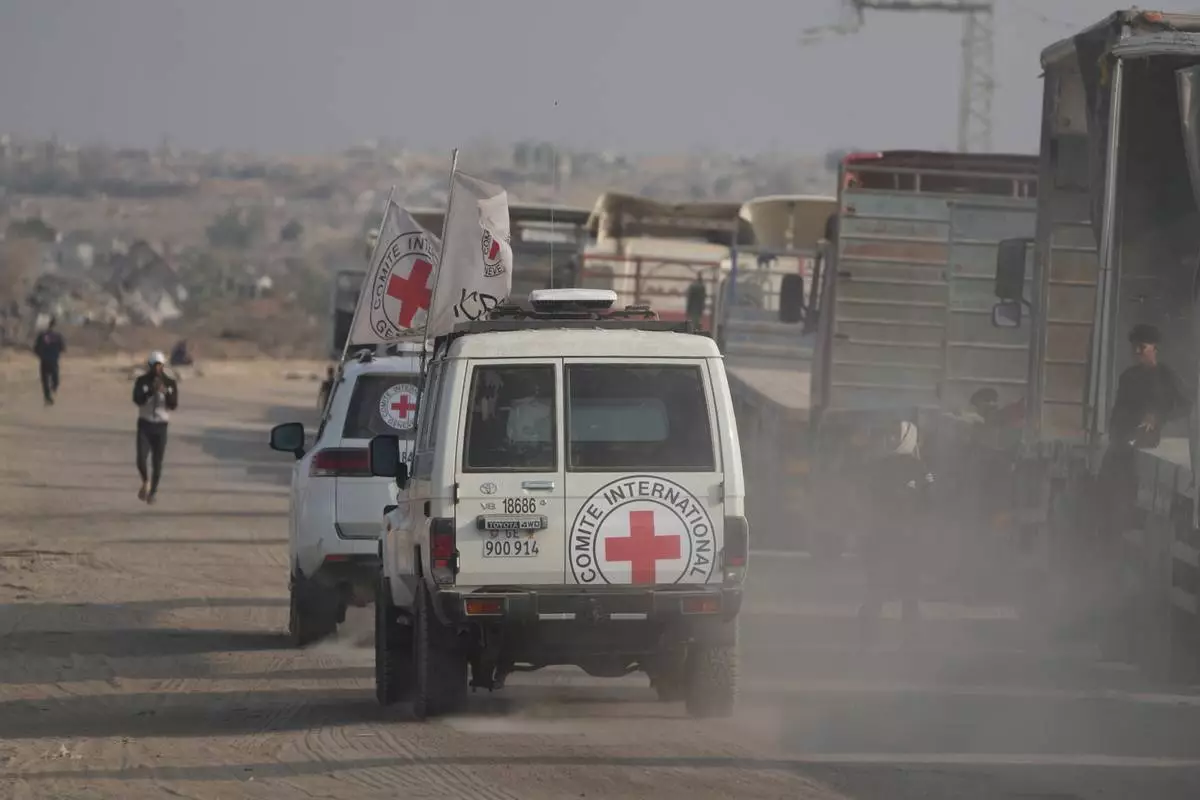 Red Cross convoy carrying the remains of a person believed to be a deceased hostage handed over by Gaza militants makes its way toward the border crossing with Israel, to be transferred to Israeli authorities, in Deir al-Balah, central Gaza Strip, Tuesday, Nov. 25, 2025. (AP Photo/Abdel Kareem Hana)