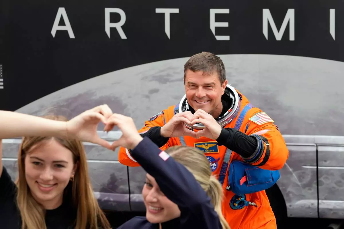 Commander Reid Wiseman poses for a photo with family members after leaving the Operations and Checkout Building for a trip to Launch Pad 39-B and a planned liftoff on NASA's Artermis II moon rocket at the Kennedy Space Center Wednesday, April 1, 2026, in Cape Canaveral, Fla. (AP Photo/Chris O'Meara)