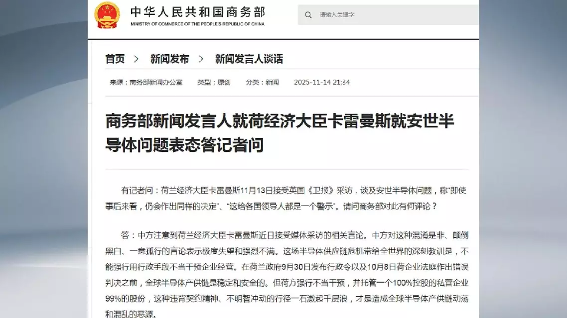 A spokesperson for the ministry made the remarks when asked to comment on a recent statement concerning the issue of the semiconductor manufacturer Nexperia, an overseas subsidiary of the Chinese company Wingtech, by Vincent Karremans, Dutch minister of economic affairs.