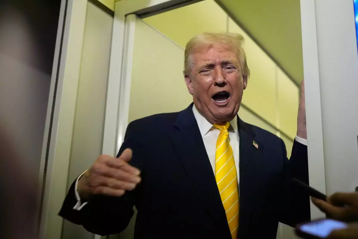President Donald Trump speaks to reporters on Air Force One on his way to his Mar-a-Lago estate in Palm Beach, Fla., Friday, Nov. 14, 2025. (AP Photo/Manuel Balce Ceneta)