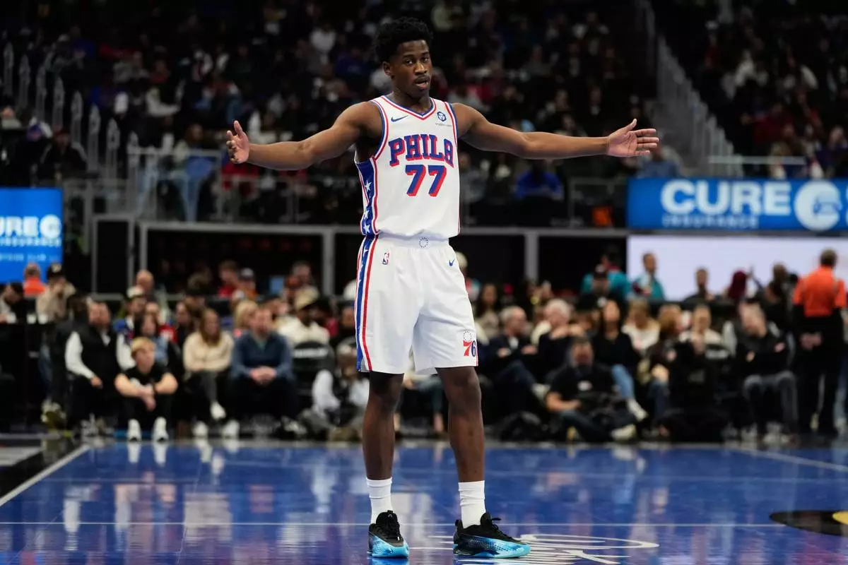 Philadelphia 76ers guard VJ Edgecombe reacts while speaking to a fan during the first half of an NBA Cup basketball game against the Detroit Pistons, Friday, Nov. 14, 2025, in Detroit. (AP Photo/Ryan Sun)