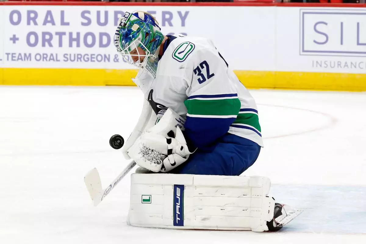 Vancouver Canucks goaltender Kevin Lankinen (32) blocks a shot of the Carolina Hurricanes during the second period of an NHL hockey game in Raleigh, N.C., Friday, Nov. 14, 2025. (AP Photo/Karl DeBlaker)
