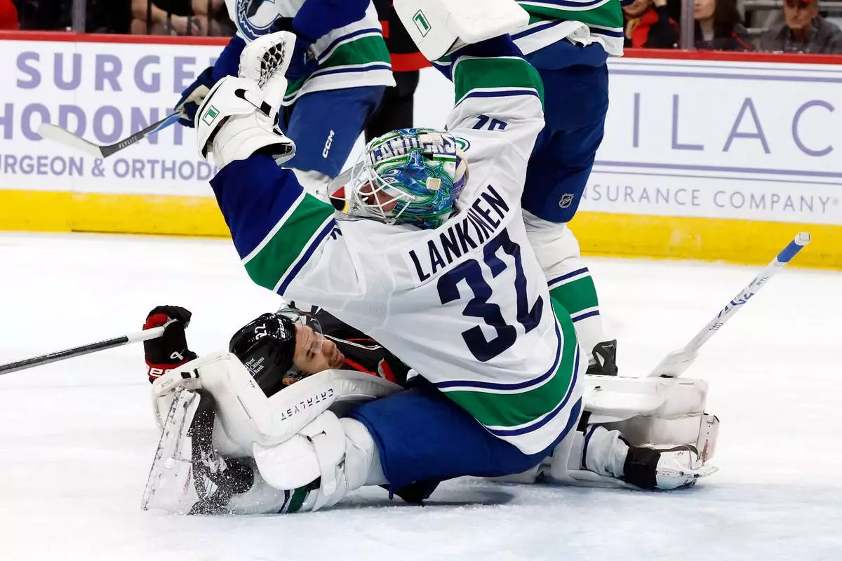 Conor Garland, Max Sasson, Elias Pettersson scored for Vancouver, which has lost three straight. Kevin Lankinen stopped 34 shots.