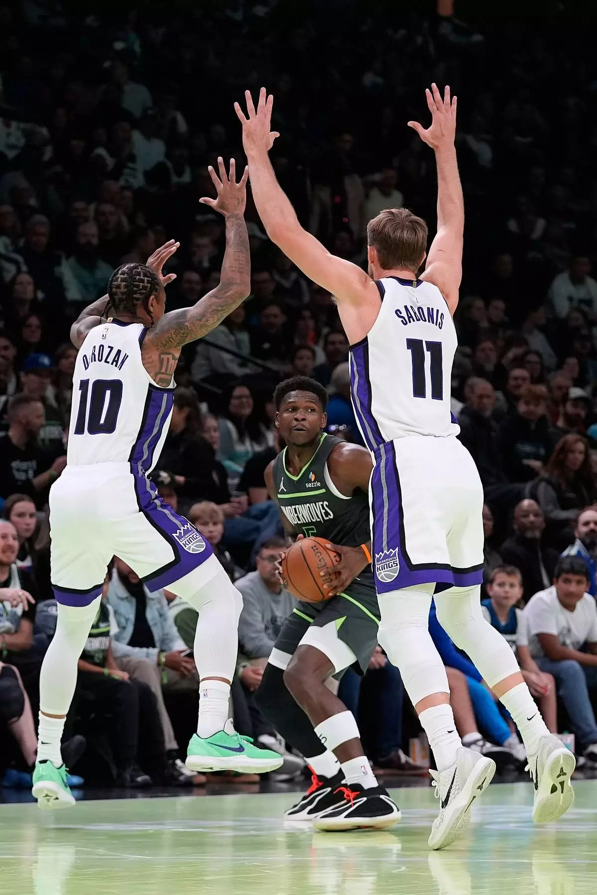 Minnesota Timberwolves guard Anthony Edwards (5) handles the ball as Sacramento Kings guard DeMar DeRozan (10) and forward Domantas Sabonis (11) defend during the first half of an NBA Cup basketball game Friday, Nov. 14, 2025, in Minneapolis. (AP Photo/Abbie Parr)