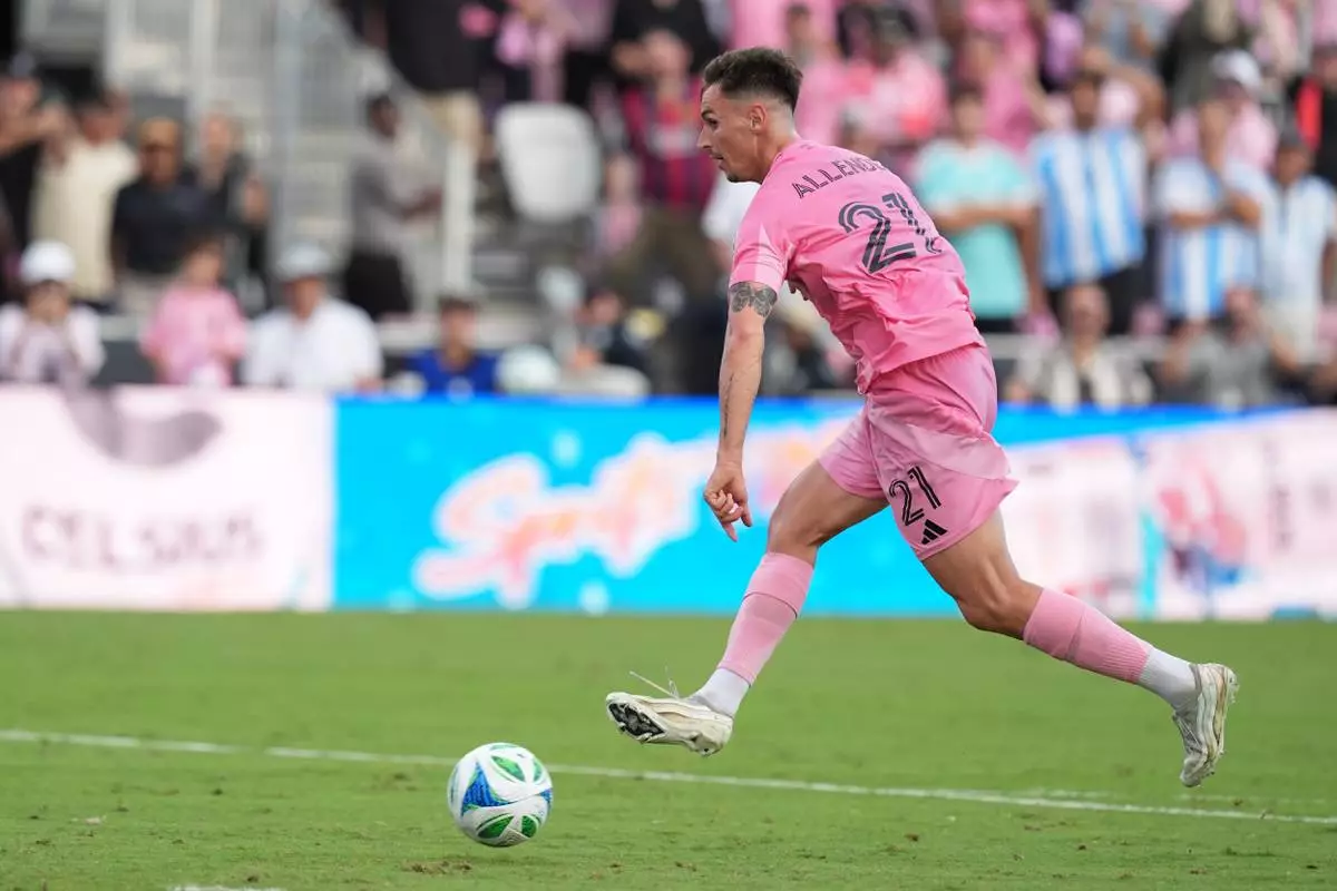 Inter Miami forward Tadeo Allende (21) celebrates his goal during the second half of the MLS Cup final soccer match against the Vancouver Whitecaps Saturday, Dec. 6, 2025, in Fort Lauderdale, Fla. (AP Photo/Rebecca Blackwell)