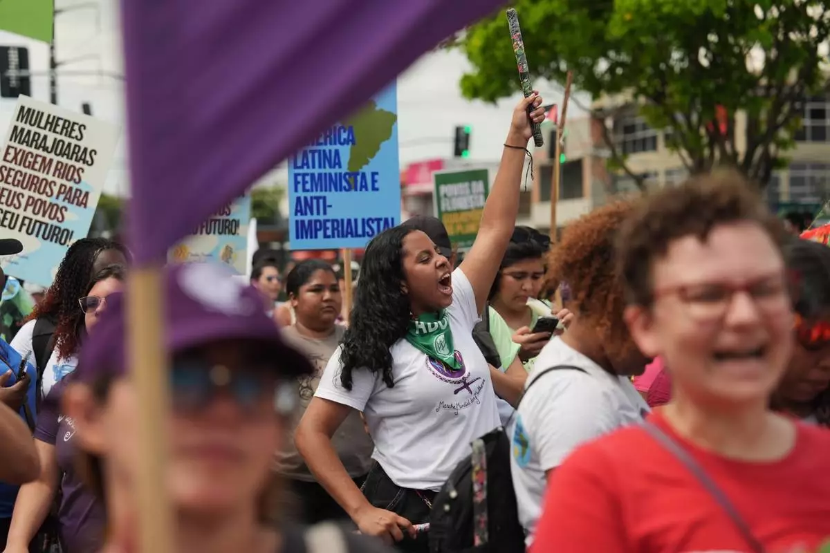 BELEM, Brazil (AP) — Some wore black dresses to signify a funeral for fossil fuels. Hundreds wore red shirts, symbolizing the blood of colleagues fighting to protect the environment. And others chanted, waved huge flags or held up signs Saturday in what's traditionally the biggest day of protest at the halfway point of annual United Nations climate talks.