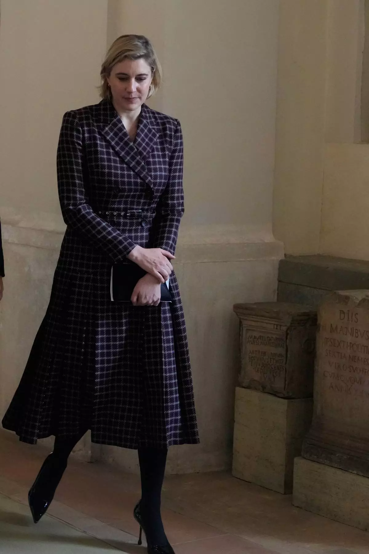 Actress Greta Gerwig leaves at the end of an audience of Pope Leo XIV with actors and directors from the cinema, at the Vatican, Saturday, Nov. 15, 2025. (AP Photo/Gregorio Borgia)