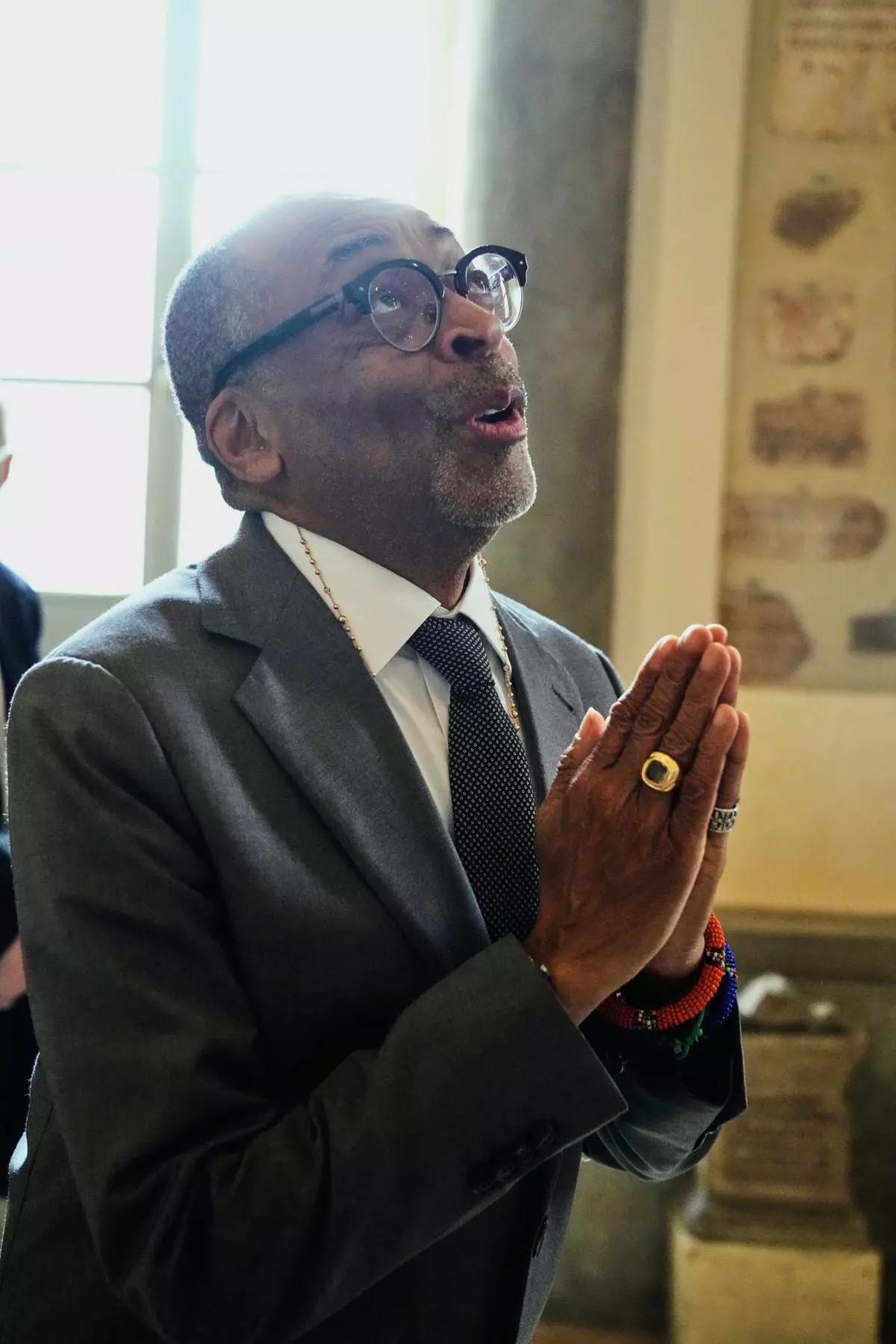 Film Director Spike Lee gestures as he leaves at the end of an audience of Pope Leo XIV with actors and directors from the cinema at the Vatican, Saturday, Nov. 15, 2025. (AP Photo/Gregorio Borgia)