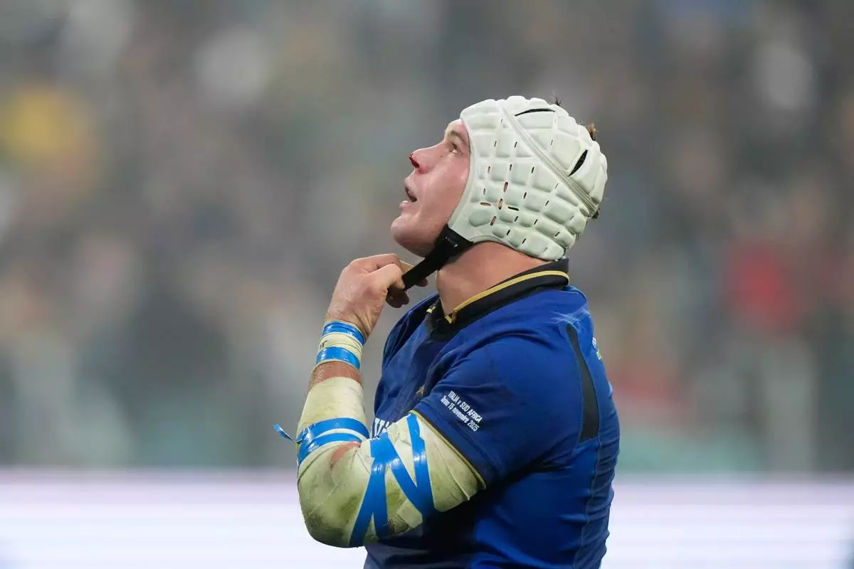 Italy's Juan Ignacio Brex reacts during the rugby union Nations Series match between Italy and South Africa, in Turin, Italy, Saturday, Nov. 15, 2025. (AP Photo/Luca Bruno)