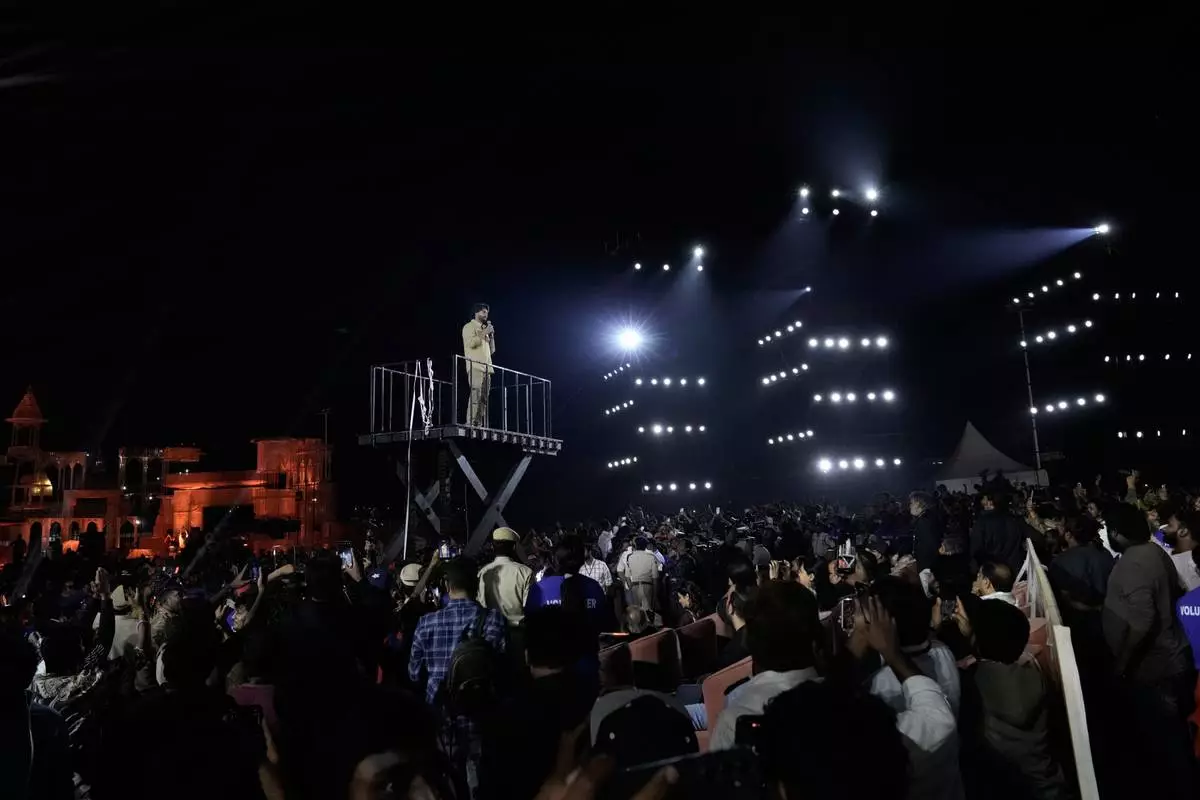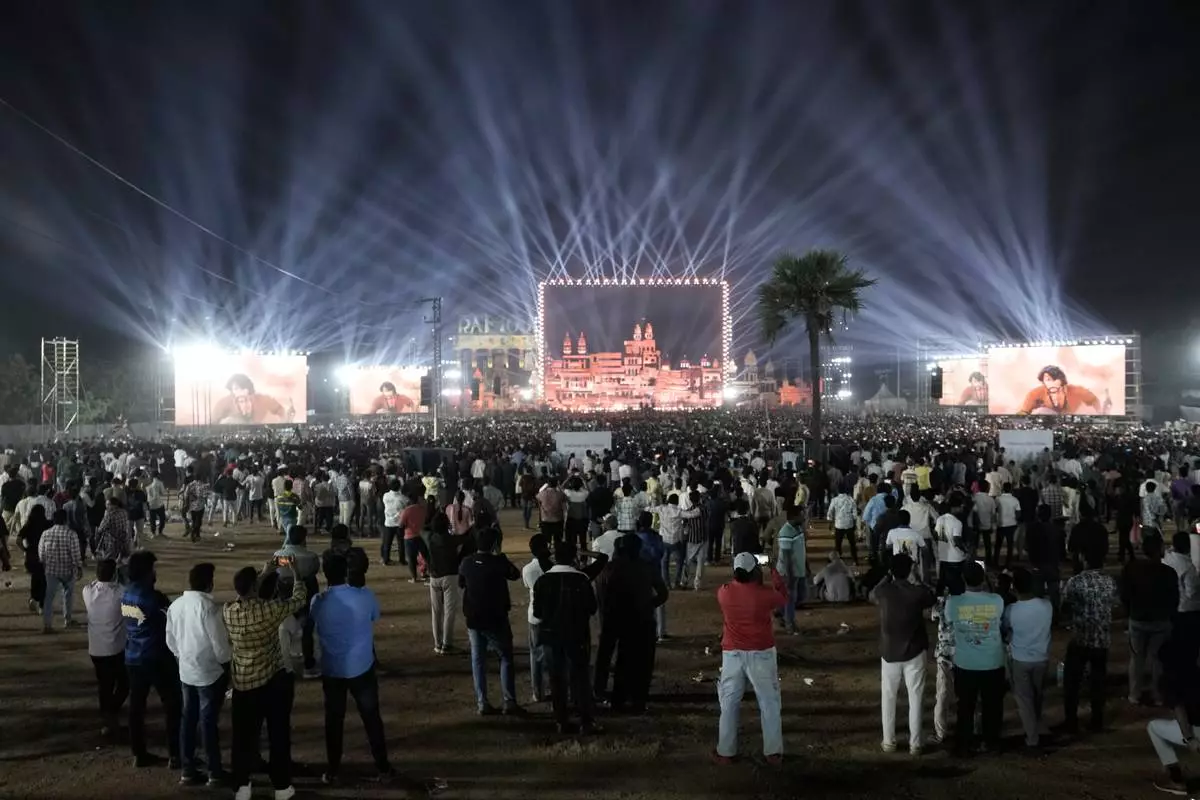 Thousands of frenzied fans watched the film’s first glimpse on a mammoth 110-by-130-foot (33.5-by-39.5-meter) screen flanked by replicas of Varanasi city. A display of colorful lights and dazzling fireworks lit up the venue as crowds danced to the foot-tapping tunes of Telugu music — a mix of new songs and classics — turning the event into a vibrant festival.