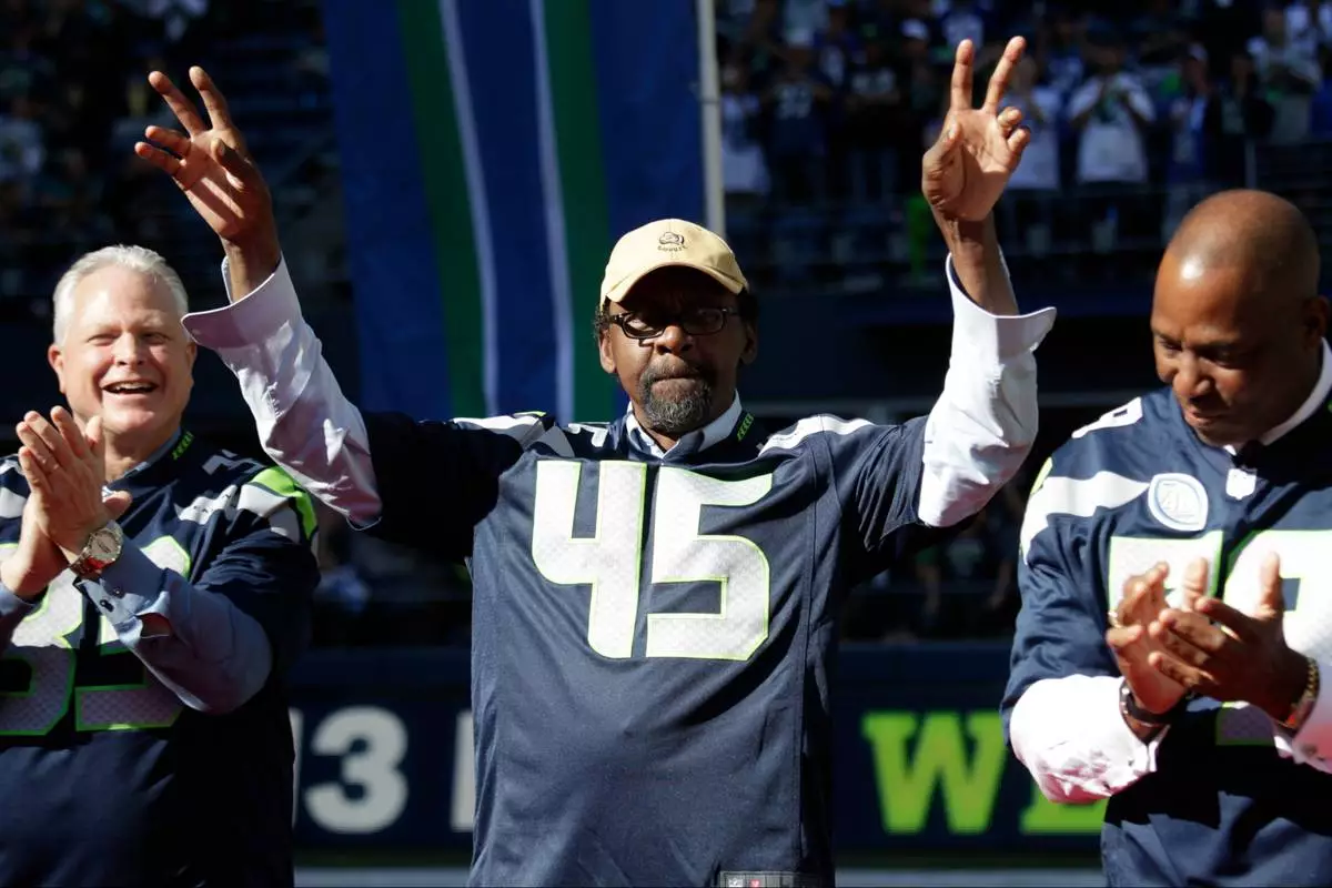FILE - In this Sept. 27, 2015, former Seattle Seahawks' Kenny Easley (45) is recognized during a halftime celebration of the 40th anniversary of the team during an NFL football game against the Chicago Bears in Seattle..(AP Photo/John Froschauer, File)
