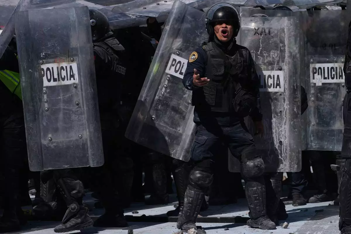 An officer yells at protesters charging at police during a youth anti-government march in Mexico City, Saturday, Nov. 15, 2025. (AP Photo/Marco Ugarte)
