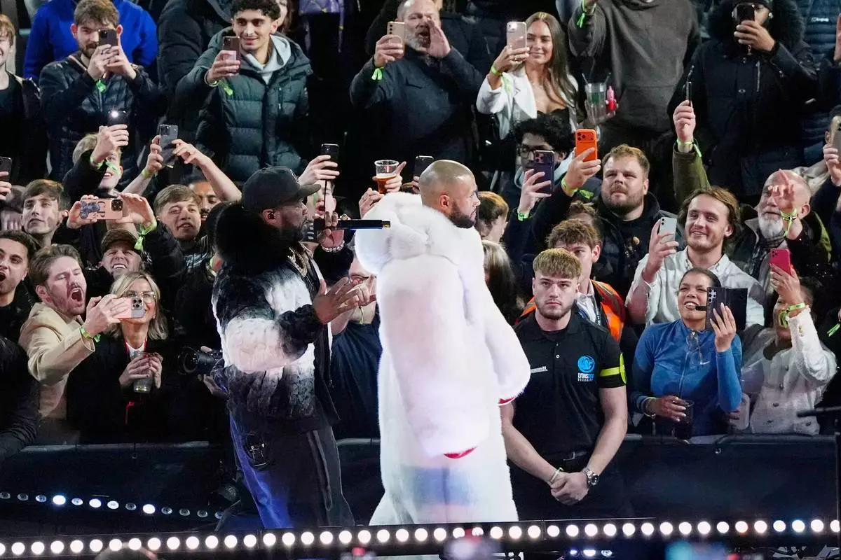 Chris Eubank Jr. walks out with 50 Cent, left, before Eubank's fight against Conor Benn at the Tottenham Hotspur Stadium in London on Saturday, Nov. 15, 2025. (Nick Potts/PA via AP)