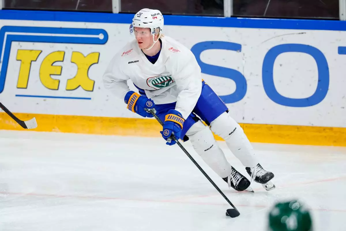 NHL star Rasmus Dahlin trains on ice with Frölunda HC at Frölundaborg in Gothenburg, Sweden, Friday Nov. 14, 2025. (Adam Ihse/TT News Agency via AP)