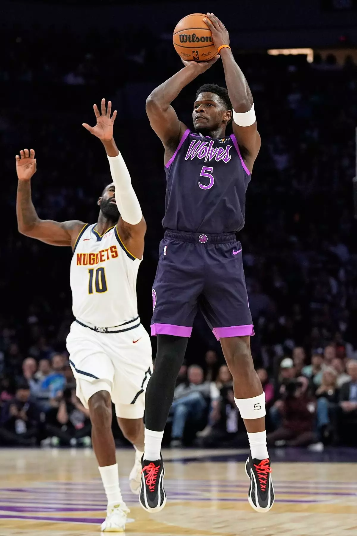 Minnesota Timberwolves guard Anthony Edwards (5) shoots as Denver Nuggets guard Tim Hardaway Jr. (10) defends during the first half of an NBA basketball game, Saturday, Nov. 15, 2025, in Minneapolis. (AP Photo/Abbie Parr)