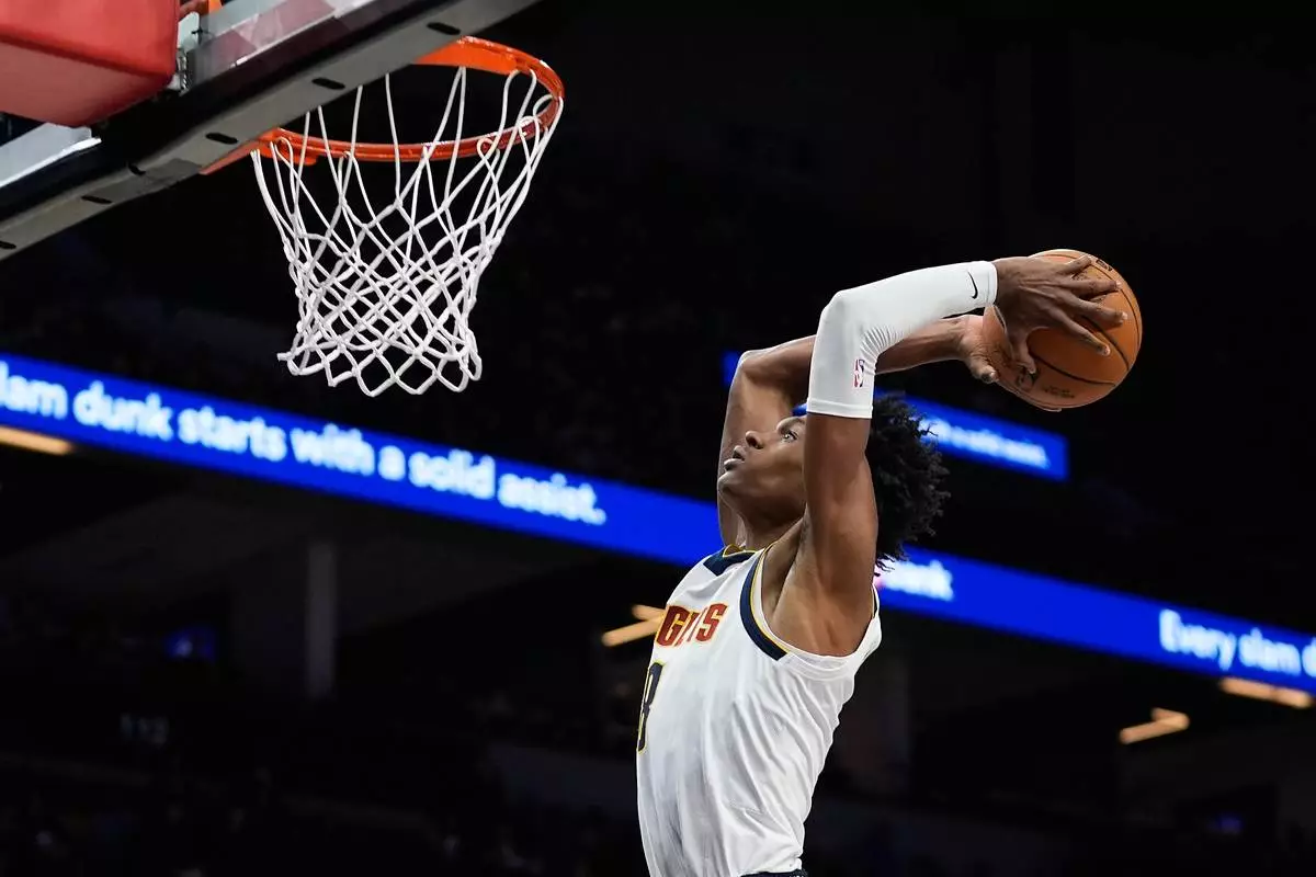 Denver Nuggets guard Peyton Watson (8) goes up for a dunk during the second half of an NBA basketball game against the Minnesota Timberwolves, Saturday, Nov. 15, 2025, in Minneapolis. (AP Photo/Abbie Parr)