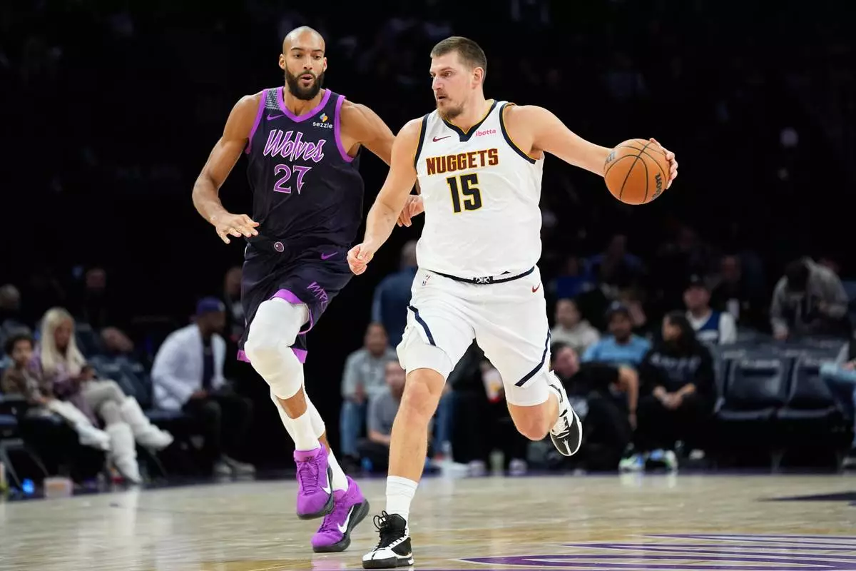 Denver Nuggets center Nikola Jokic (15) works toward the basket as Minnesota Timberwolves center Rudy Gobert (27) defends during the second half of an NBA basketball game, Saturday, Nov. 15, 2025, in Minneapolis. (AP Photo/Abbie Parr)