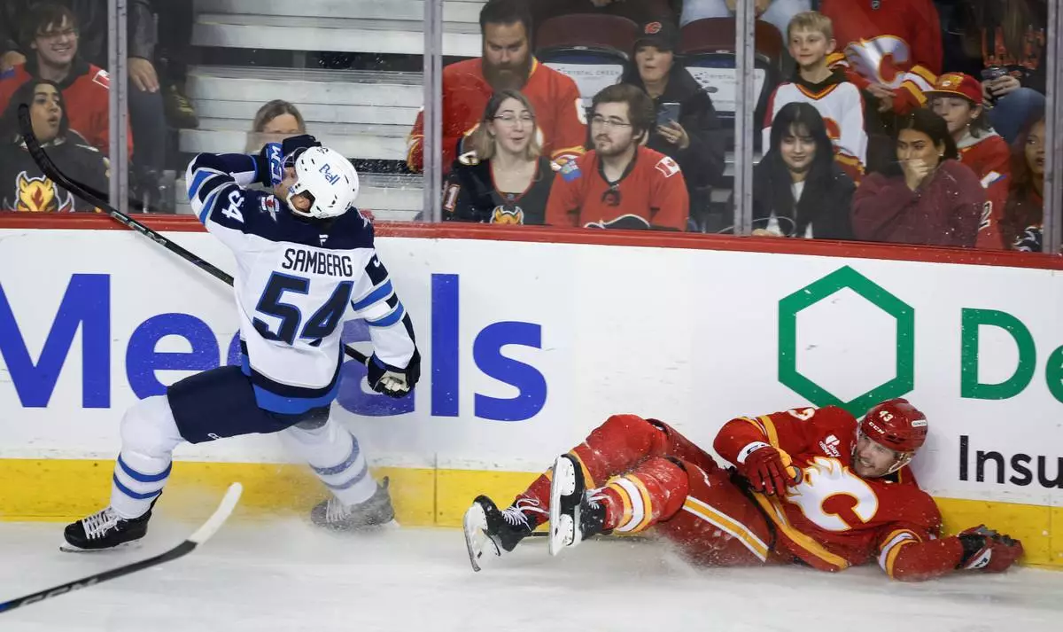 Winnipeg Jets' Dylan Samberg (54) checks Calgary Flames' Adam Klapka during the first period of an NHL hockey game in Calgary, Alberta, Saturday, Nov. 15, 2025. (Jeff McIntosh/The Canadian Press via AP)