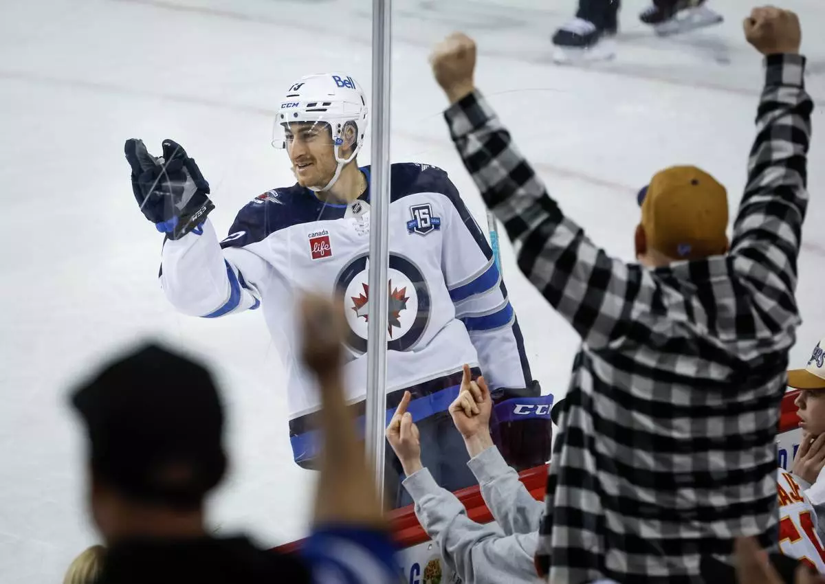 Winnipeg Jets' Gabriel Vilardi celebrates his game-winning goal against the Calgary Flames during a shootout in overtime in an NHL hockey game in Calgary, Alberta, Saturday, Nov. 15, 2025. (Jeff McIntosh/The Canadian Press via AP)