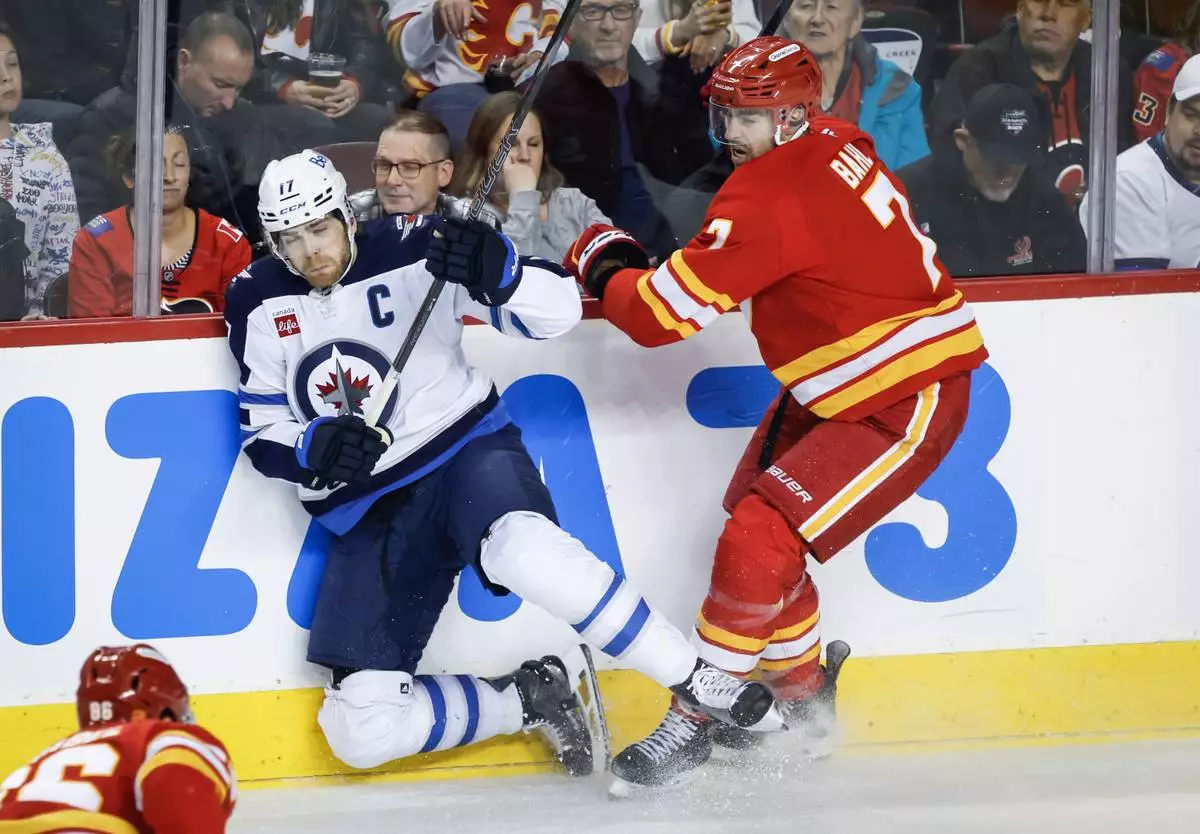Winnipeg Jets' Adam Lowry (17) is checked by Calgary Flames' Kevin Bahl during the first period of an NHL hockey game in Calgary, Alberta, Saturday, Nov. 15, 2025. (Jeff McIntosh/The Canadian Press via AP)
