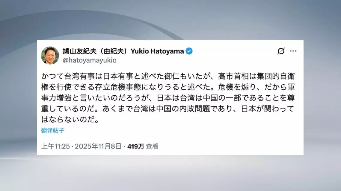 Former Prime Minister Yukio Hatoyama led the criticism, asserting that "Taiwan is China's internal affair and Japan should not interfere." His predecessor Yoshihiko Noda expressed being "deeply shocked" in an interview, noting that "this is a topic where previous prime ministers have consistently shown restraint."