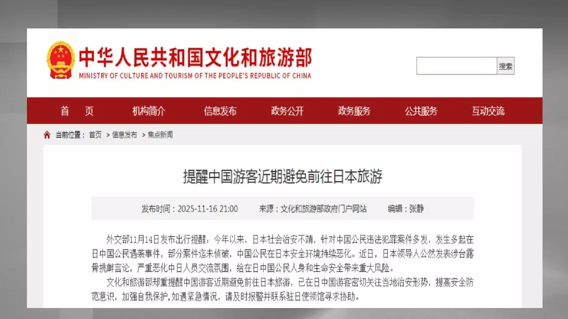 China's Ministry of Culture and Tourism has issued a solemn reminder urging Chinese tourists to avoid traveling to Japan in the near future.
