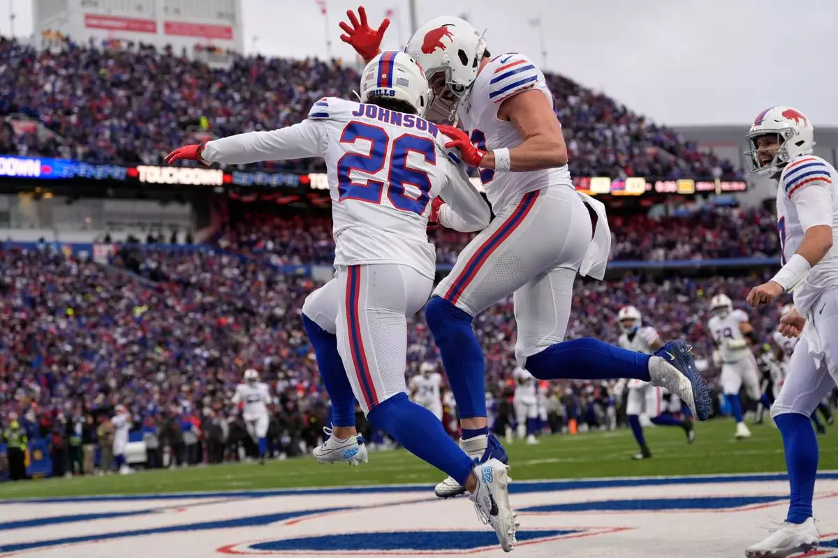 Buffalo Bills quarterback Josh Allen (17) celebrates with tight end Dawson Knox, right, after a touchdown by running back Ty Johnson, center, against the Tampa Bay Buccaneers during the first half of an NFL football game, Sunday, Nov. 16, 2025, in Orchard Park, N.Y. (AP Photo/Jeffrey T. Barnes)