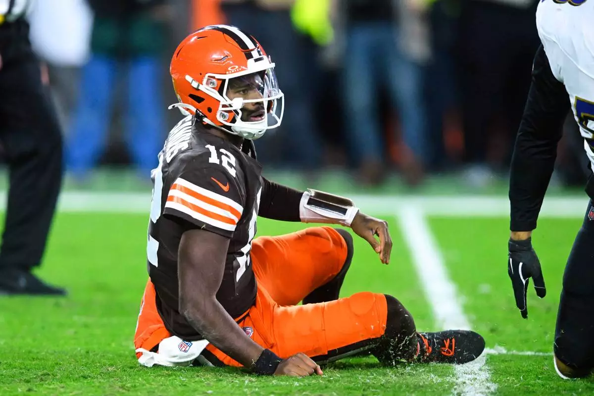 Cleveland Browns quarterback Shedeur Sanders sits on the field watching after throwing an interception in the second half of an NFL football game against the Baltimore Ravens in Cleveland, Sunday, Nov. 16, 2025. (AP Photo/David Richard)