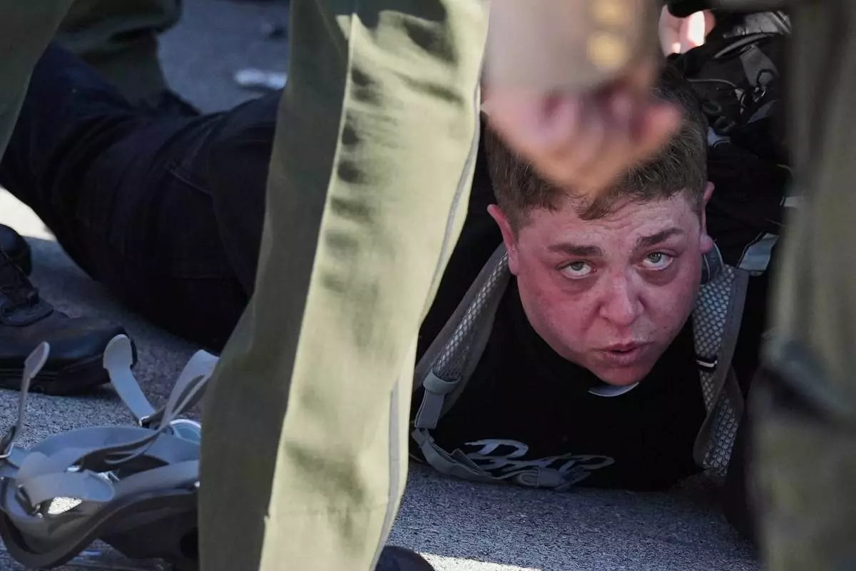 Illinois State police detain a protester outside an ICE processing facility in the Chicago suburb of Broadview, Ill., Friday, Nov. 14, 2025. (AP Photo/Nam Y. Huh)