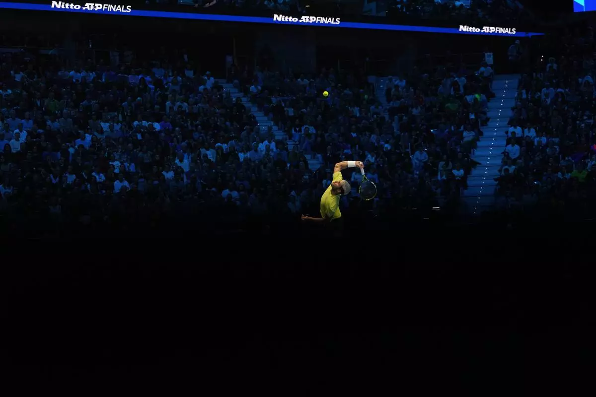 Spain's Carlos Alcaraz serves to Canada's Felix Auger-Aliassime during semifinal tennis match of the ATP World Tour Finals, in Turin, Italy, Saturday, Nov. 15, 2025. (AP Photo/Antonio Calanni)