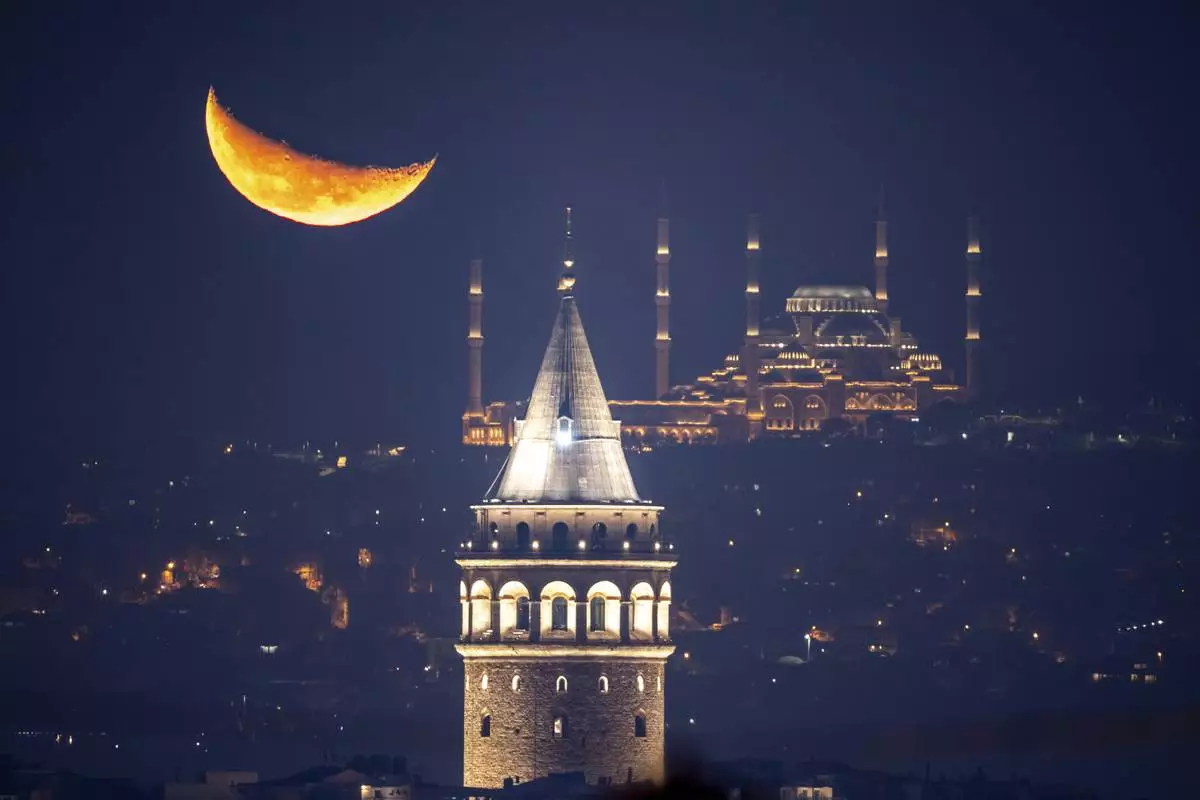 The crescent moon rises behind the Camlica mosque and Galata tower, in Istanbul, Turkey, early Friday, Nov. 14, 2025. (AP Photo/Emrah Gurel)