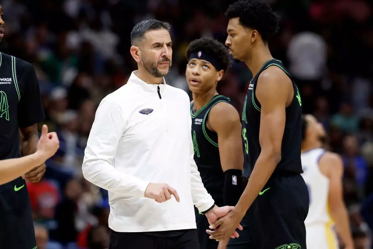 New Orleans Pelicans interim head coach James Borrego reacts as players walk off the court in a timeout during the third quarter of an NBA basketball game against the Golden State Warriors, Sunday, Nov. 16, 2025, in New Orleans. (AP Photo/Butch Dill)