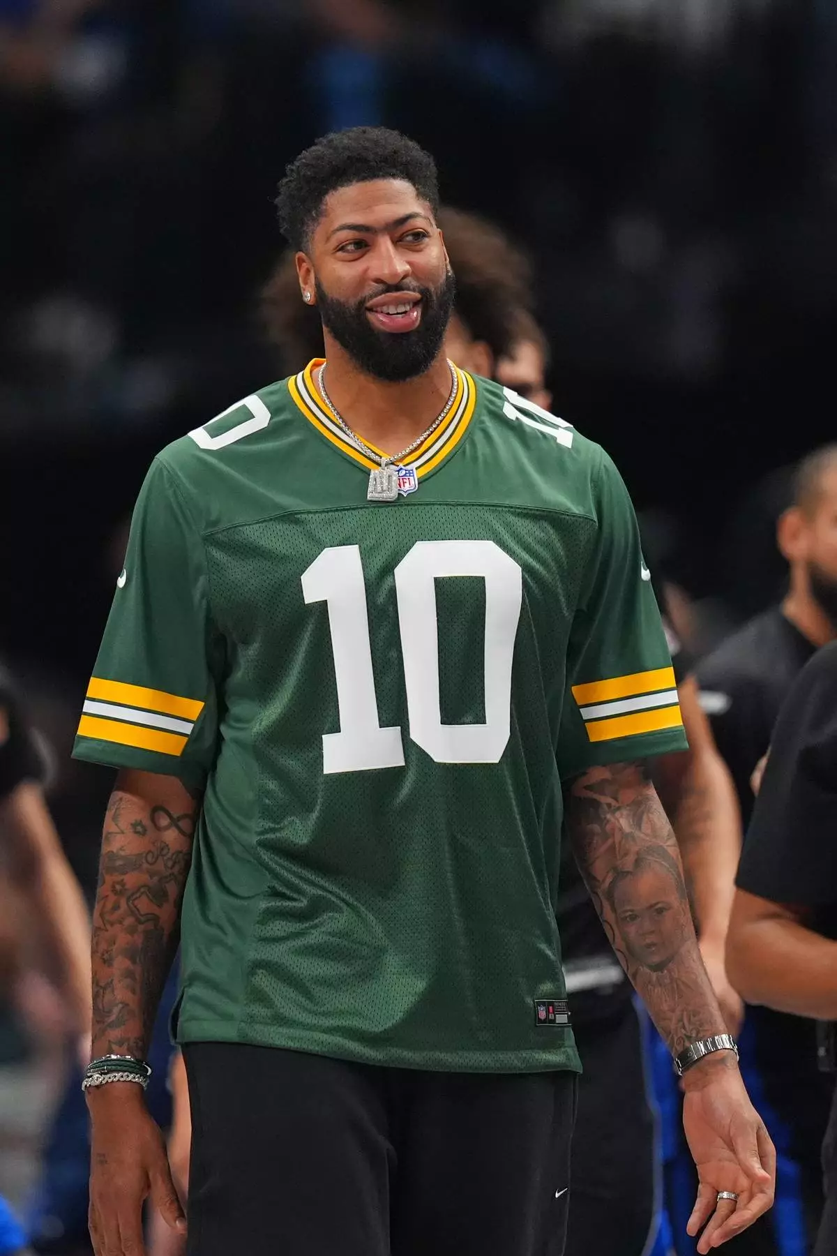 Dallas Mavericks forward Anthony Davis wears a NFL quarterback Jordan Love, of the Green Bay Packers, during the first half of an NBA basketball game against the Portland Trail Blazers Sunday, Nov. 16, 2025, in Dallas. (AP Photo/Julio Cortez)