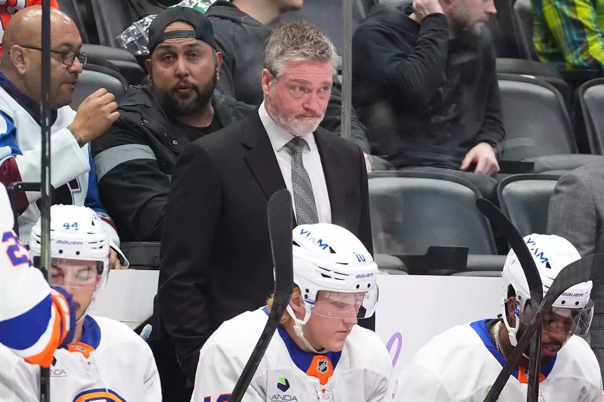 New York Islanders head coach Patrick Roy looks on from the team box in the second period of an NHL hockey game against the Colorado Avalanche Sunday, Nov. 16, 2025, in Denver. (AP Photo/David Zalubowski)