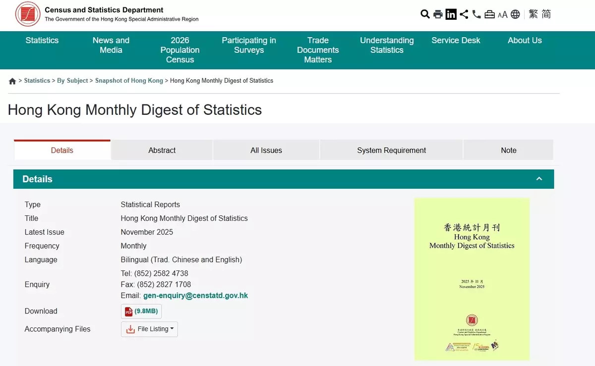 The Census and Statistics Department (C&SD) published today (November 17) the November 2025 issue of the "Hong Kong Monthly Digest of Statistics" (HKMDS).