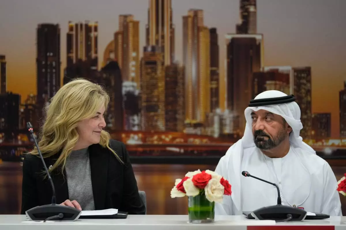 Stephanie Pope, President and CEO of Boeing Commercial Airplanes, left, Sheikh Ahmed bin Saeed Al Maktoum, President, Dubai Civil Aviation Authority and Chairman of Emirates airlines, speak during a press conference on the opening day of the Dubai Air Show, United Arab Emirates, Monday, Nov. 17, 2025. (AP Photo/Altaf Qadri)