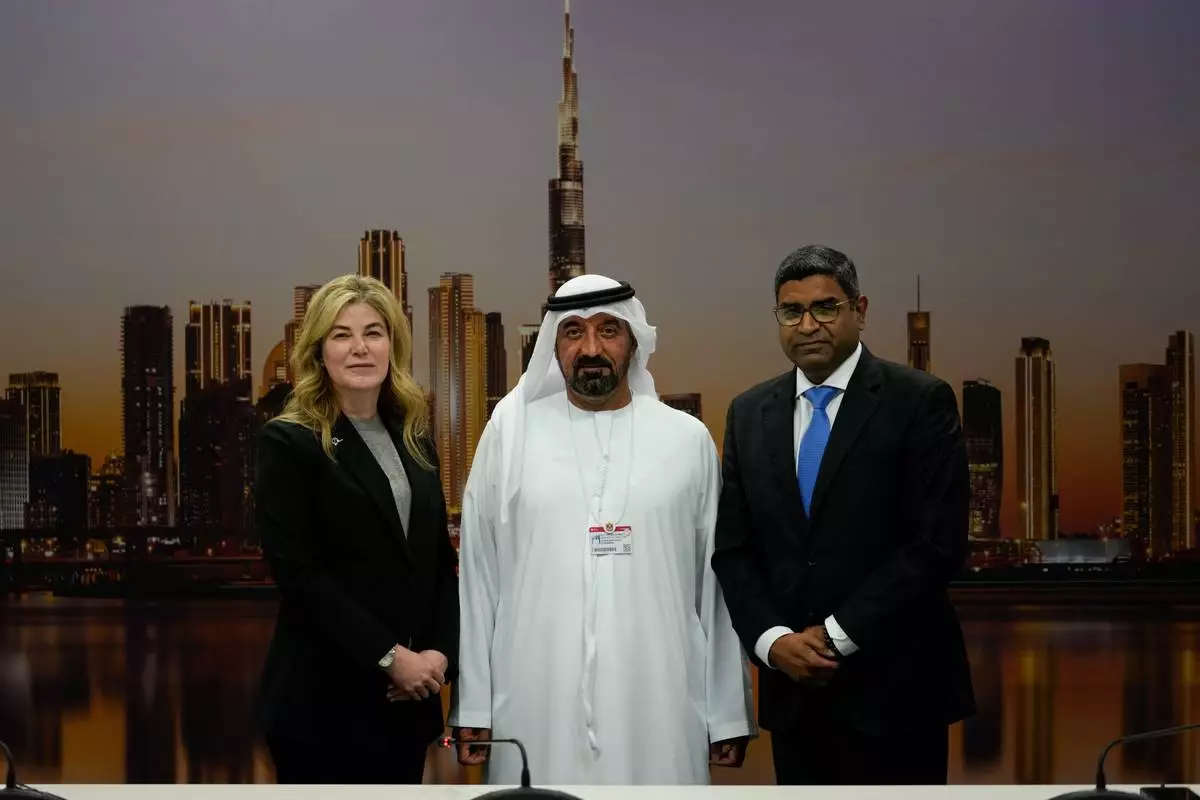 Stephanie Pope, President and CEO of Boeing Commercial Airplanes, left, Sheikh Ahmed bin Saeed Al Maktoum, President, Dubai Civil Aviation Authority and Chairman of Emirates airlines, centre, and Mahendra Nair, group vice-president GE Aerospace, pose during a press conference on the opening day of the Dubai Air Show, United Arab Emirates, Monday, Nov. 17, 2025. (AP Photo/Altaf Qadri)