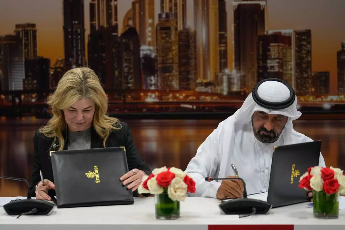 Stephanie Pope, President and CEO of Boeing Commercial Airplanes, left, and Sheikh Ahmed bin Saeed Al Maktoum, President, Dubai Civil Aviation Authority and Chairman of Emirates airlines, sign an agreement to order 65 additional Boeing 777X aircrafts during a press conference on the opening day of the Dubai Air Show, United Arab Emirates, Monday, Nov. 17, 2025. (AP Photo/Altaf Qadri)