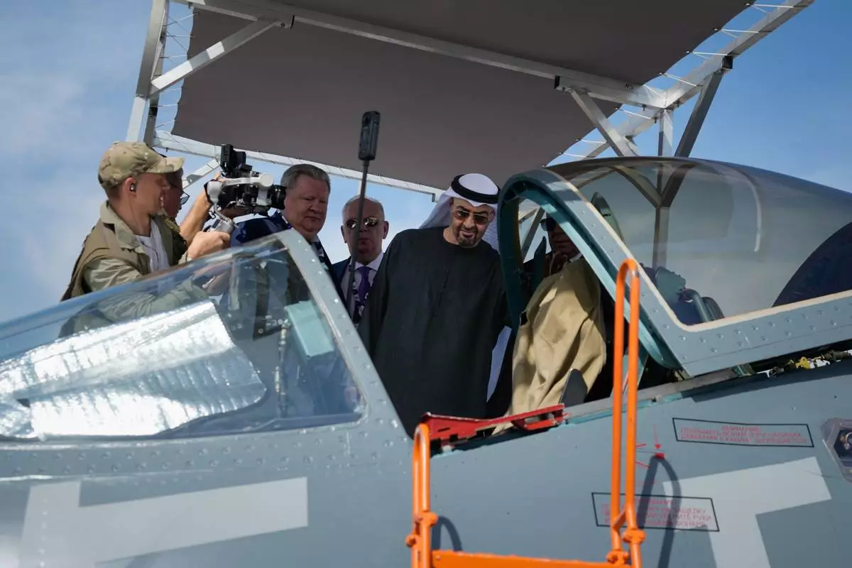 Sheikh Mohammed bin Zayed Al Nahyan, the president of the United Arab Emirates and the ruler of Abu Dhabi, checks the cockpit of Russia's SU57E fighter jet at Russian pavilion during the opening day of the Dubai Air Show, United Arab Emirates, Monday, Nov. 17, 2025. (AP Photo/Altaf Qadri)