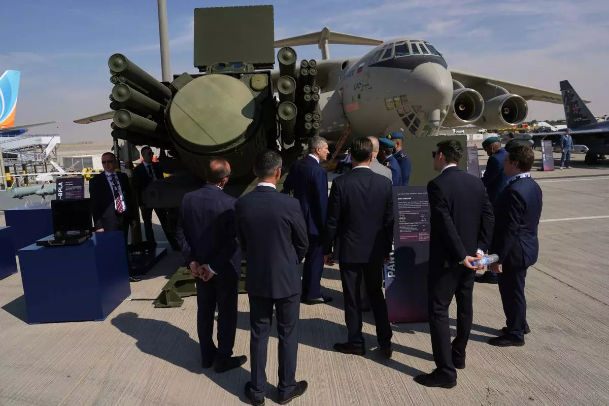 Businessmen look at a Russian Pantzir-SMD-E surface-to-air missile system at the Dubai Air Show in Dubai, United Arab Emirates, Monday, Nov. 17, 2025. (AP Photo/ Fatima Shbair)
