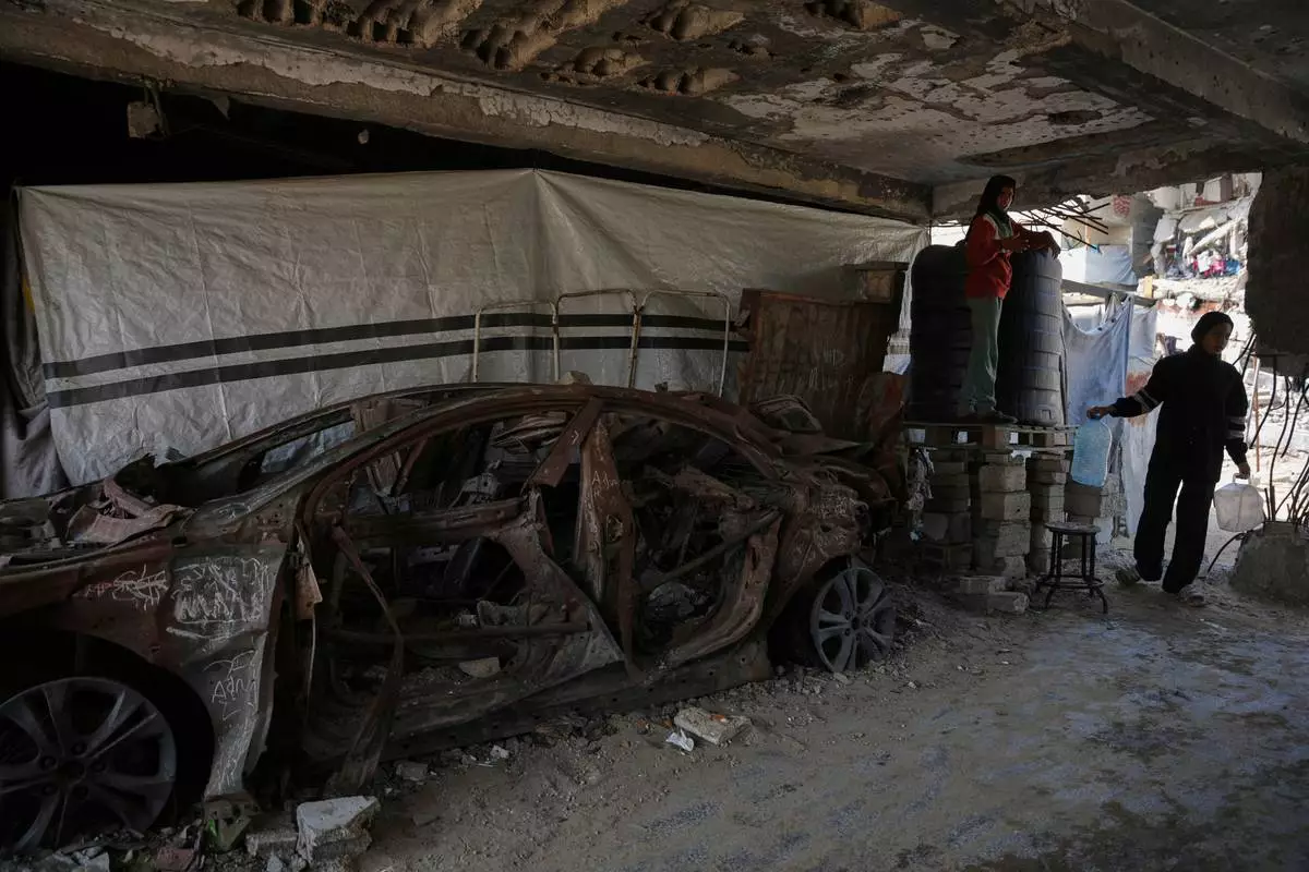 Taj al-Hindi, 14, and her sister, Rimas al-Hindi, 15, fill water tanks inside a school that was bombed in July 2024 in Khan Younis during the Israel-Hamas war, Wednesday, Nov. 12, 2025. (AP Photo/Abdel Kareem Hana)