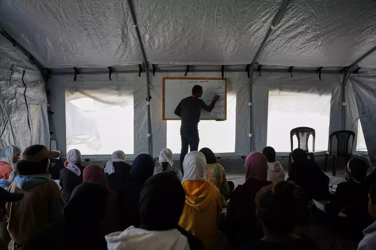 Palestinian students attend class inside a tent set up on the beach in Khan Younis, Gaza Strip, Wednesday, Nov. 12, 2025. (AP Photo/Abdel Kareem Hana)