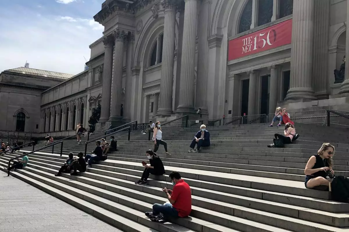 FILE - People sit outside the Metropolitan Museum of Art on May 2, 2020 in New York. (AP Photo/Ron Blum, file)