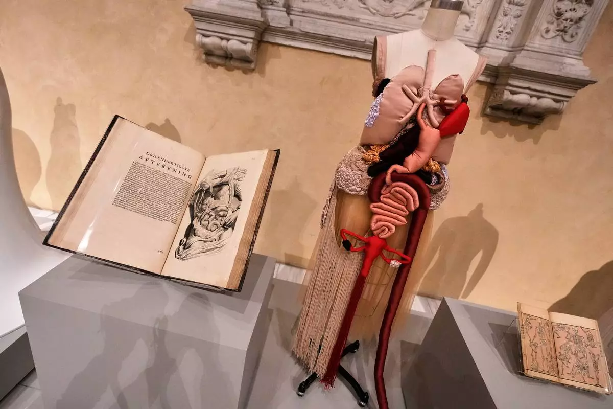 "Corset Anatomia" by Renata Buzzo, right, is displayed during the announcement, at the Metropolitan Museum of Art, in New York, Monday, Nov. 17, 2025, about the next spring fashion exhibit "Costume Art," which is set to launch at the Met Gala in 2026. (AP Photo/Richard Drew)