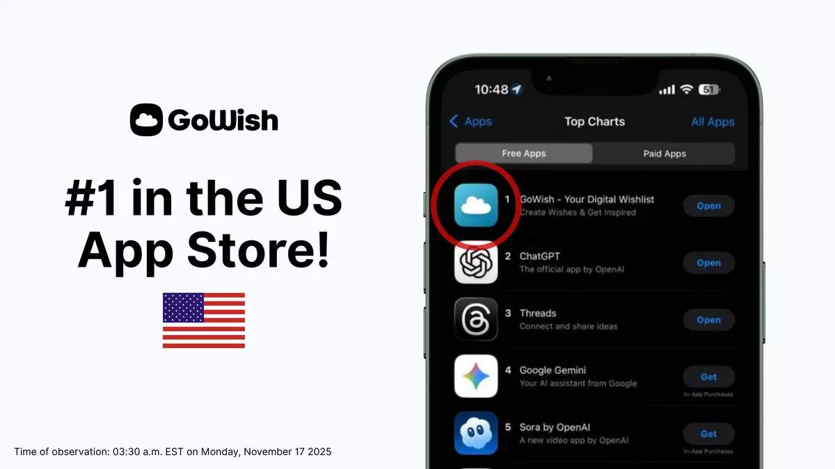 Danish wishlist app GoWish reached no. 1 on the US App Store this Monday morning as the social shopping platform added 155,403 new American users in a single day during Sunday, November 16. The achievement marks yet another high point for the Copenhagen-based company which has just rounded 15 million users globally including, as of November 16, a total of 7.234.423 registered US users as well as more than 3.5 million users in Denmark -more than half of the Danish population- where GoWish operates under its original name Ønskeskyen - or “wish cloud.”