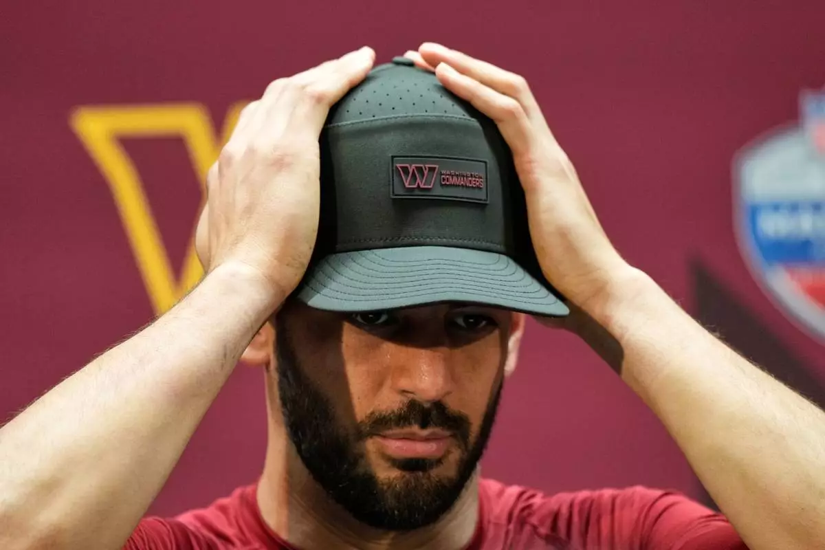 Washington Commanders quarterback Marcus Mariota (8) holds his head during a press conference after an NFL football game between the Washington Commanders and the Miami Dolphins in Madrid, Spain, Sunday, Nov. 16, 2025. (AP Photo/Bernat Armangue)