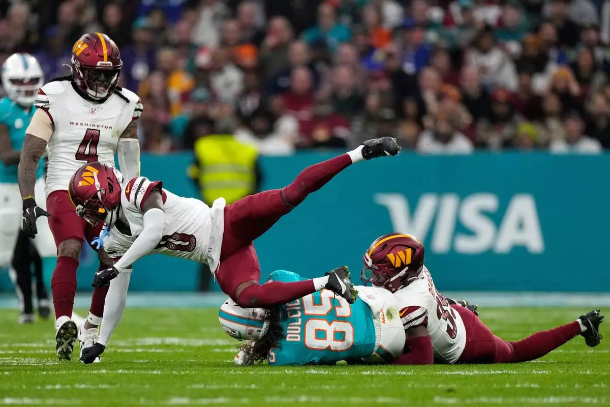 Washington Commanders cornerback Mike Sainristil (0) flies through the air after assisting with a tackle on Miami Dolphins tight end Greg Dulcich (85) during the first half of an NFL football game between the Washington Commanders and the Miami Dolphins in Madrid, Spain, Sunday, Nov. 16, 2025. (AP Photo/Bernat Armangue)